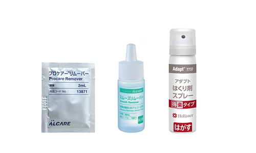 皮膚に付着した粘着剤や皮膚保護剤をはがしやすくするもので、スプレータイプやワイプタイプ・液体タイプがあります。アルコールを含有したものは、アルコールアレルギーや、皮膚障害がある場合は刺激となるため注意が必要です。