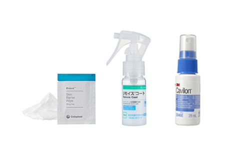 皮膚を薄膜状に被覆する薬剤です。テープ付き装具使用時のテープ部分などに使用します。テープ・装具を貼る前にあらかじめ皮膚に塗っておきます。乾燥したのを確認してから装具を貼るようにしてください。